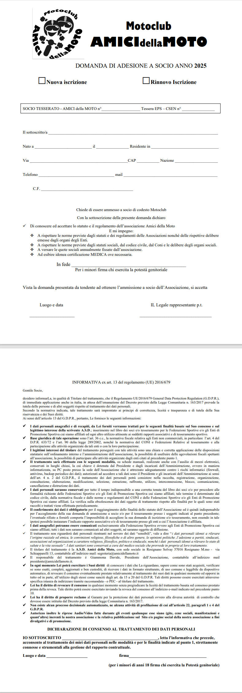 Per entrare a far parte di Amici Della Moto è necessario scaricare documento di iscrizione, compilarlo in ogni sua parte e poi scannerizzarlo.